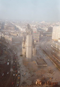 The blue Church, restored but with a reminder of the bombings with the ruined spire. |